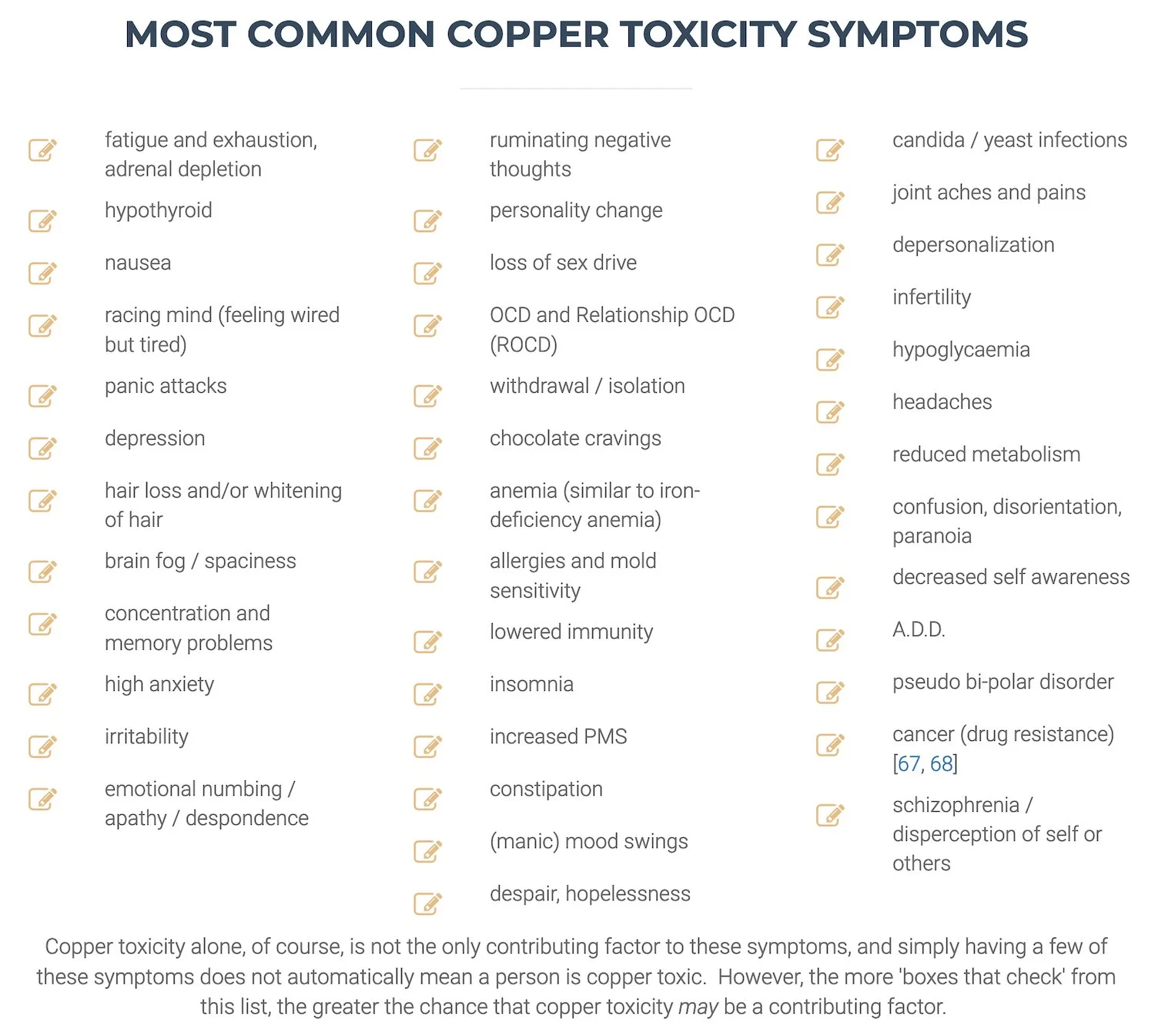 / Internet Link""If there is excess copper in the body, then a wide array of psychological and physiological symptoms and conditions can also develop like Tourette’s, schizophrenia, bipolar, mania, autism, asperger’s, anemia, hair loss and much more. Extremely high copper levels can result in a psychotic break."